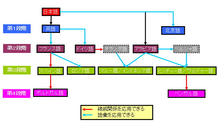再びいちからやらなければならない言語を考えると、北京語とアラビア語があります。アラビア語の語彙はヒンディー語/ウルドゥー語とマレー語/インドネシア語に応用可能です。ヒンディー語/ウルドゥー語は縁戚関係から、ベンガル語へ応用が利きます。そこで、まとめると下のようになります。